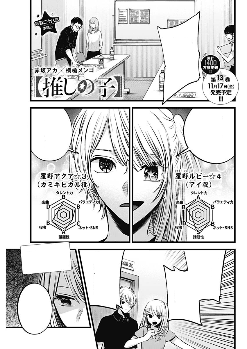 Script Reading「本読み, Hon Yomi?」 is the one-hundred twenty-eighth chapter of Oshi no Ko manga series. It is written by Aka Akasaka and illustrated by Mengo Yokoyari.