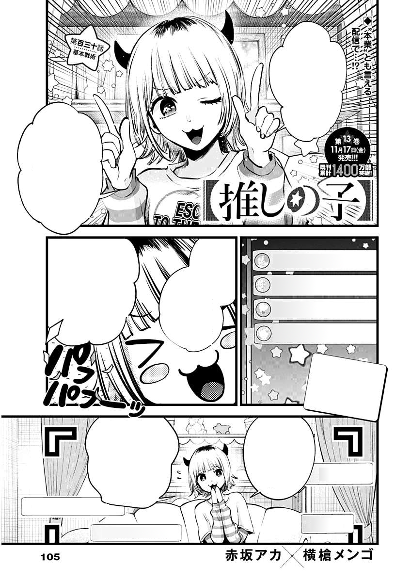 Basic Tactic「基本戦術, Kihon Senjutsu?」 is the one-hundred thirtieth chapter of Oshi no Ko manga series. It is written by Aka Akasaka and illustrated by Mengo Yokoyari.