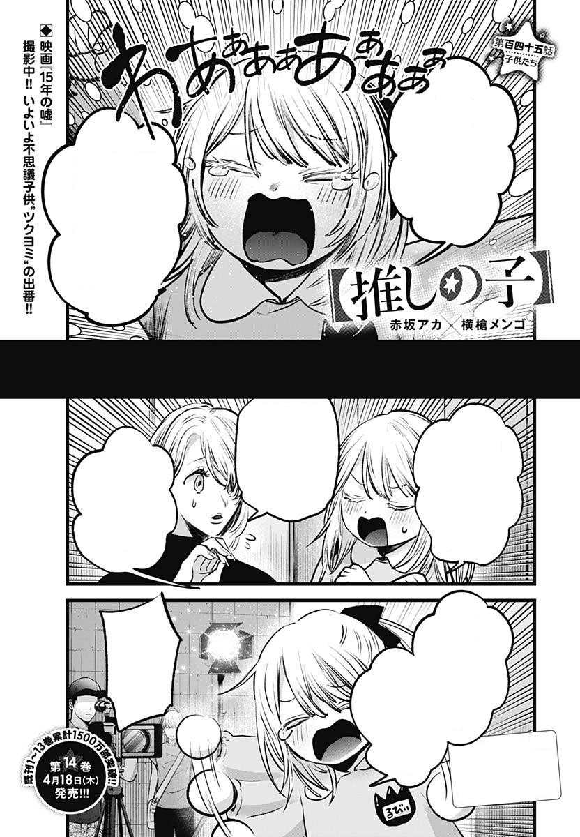 Children「子供たち, Kodomo-tachi?」 is the one hundred and forty-fifth chapter of Oshi no Ko manga series. It is written by Aka Akasaka and illustrated by Mengo Yokoyari. It was released in Weekly Young Jump on April 3, 2024.