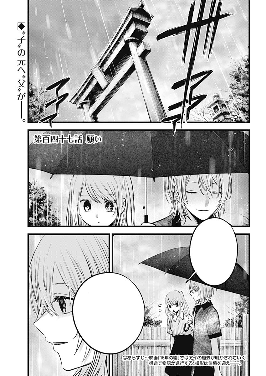 Wish「願い, Negai?」 is the one hundred and forty-seventh chapter of Oshi no Ko manga series. It is written by Aka Akasaka and illustrated by Mengo Yokoyari. It was released in Weekly Young Jump on April 25, 2024.