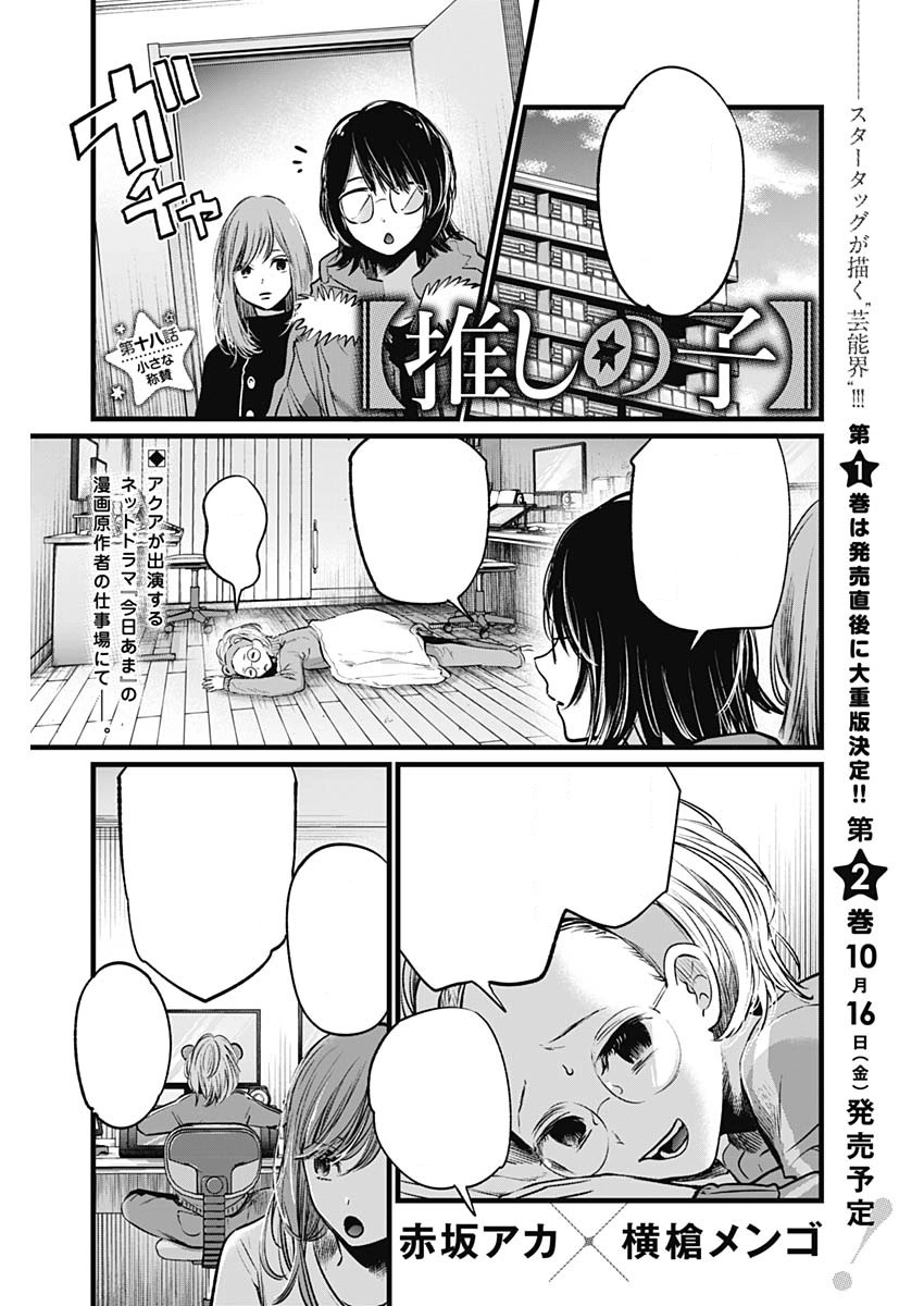 Modest Praise「小さな称賛, Chīsana Shōsan?」 is the eighteenth chapter of the Oshi no Ko manga series. It is written by Aka Akasaka and illustrated by Mengo Yokoyari. It was released in Weekly Young Jump on September 17, 2020[1], and in Mangaplus on May 19, 2022.[2]