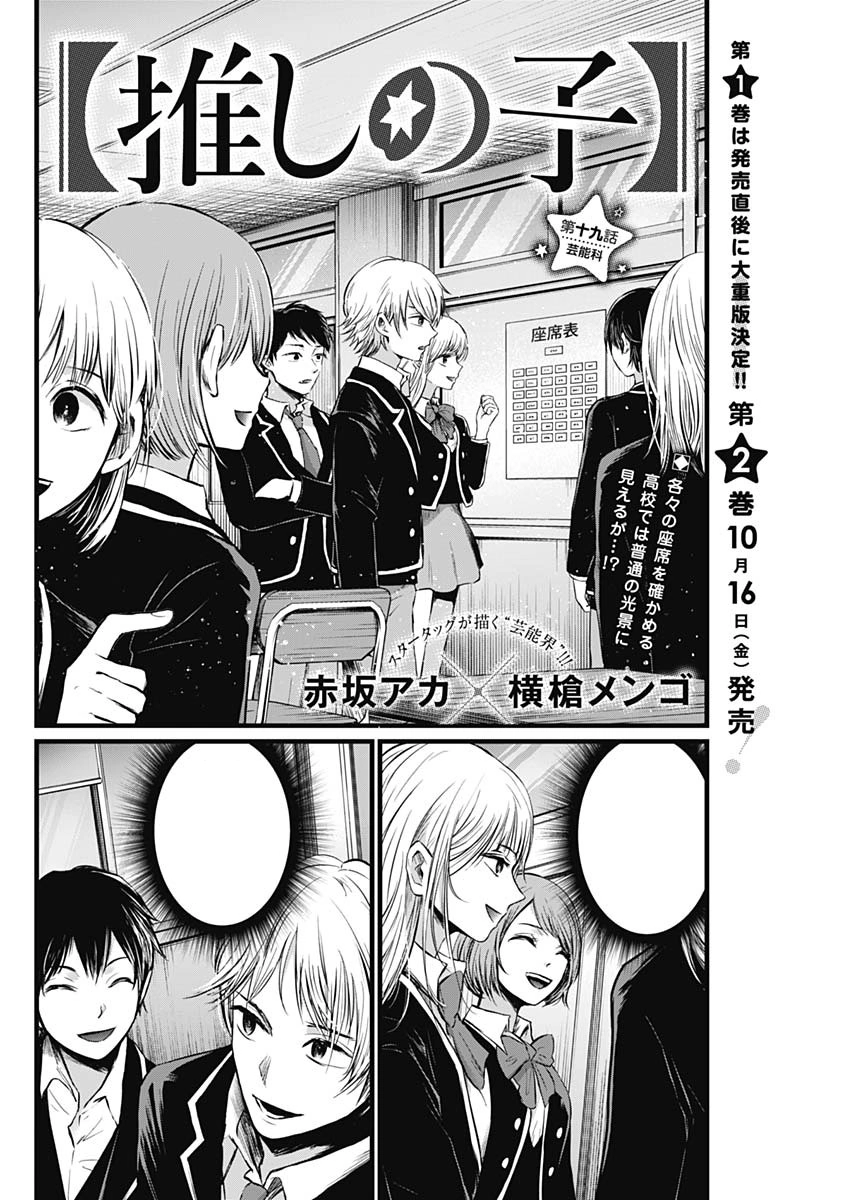 The Entertainment Department「芸能科, Geinō-ka?」 is the nineteenth chapter of the Oshi no Ko manga series. It is written by Aka Akasaka and illustrated by Mengo Yokoyari. It was released in Weekly Young Jump on September 24, 2020[1], and in Mangaplus on May 19, 2022.[2]