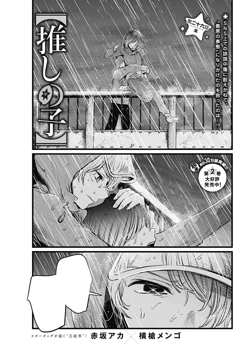 Storm「嵐, Arashi?」 is the twenty-sixth chapter of the Oshi no Ko manga series. It is written by Aka Akasaka and illustrated by Mengo Yokoyari. It was released in Weekly Young Jump on November 26, 2020.[1]