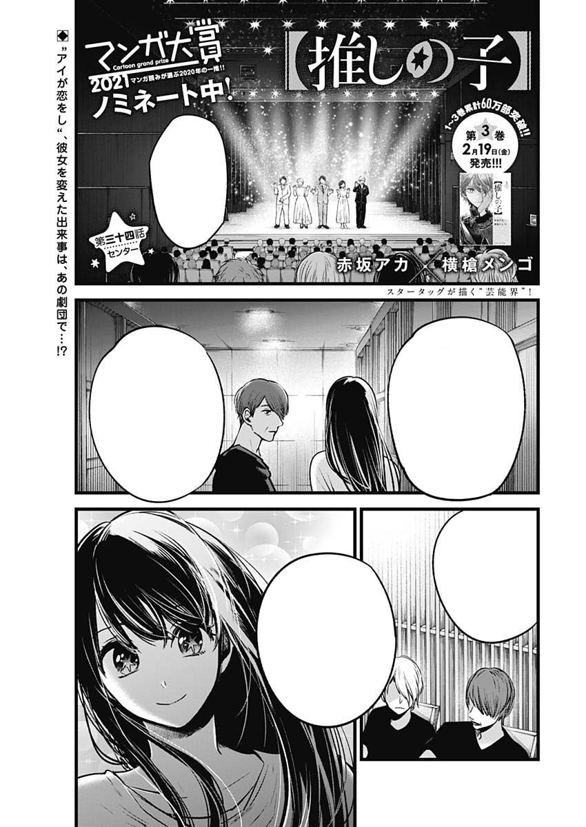 Center「センター, Sentā?」 is the thirty-fourth chapter of the Oshi no Ko manga series. It is written by Aka Akasaka and illustrated by Mengo Yokoyari. It was released in Weekly Young Jump on February 18, 2021.[1]