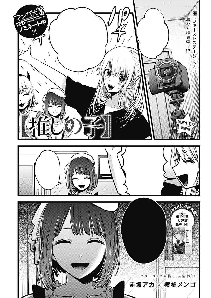 Responsible「責任感, Sekinin-kan?」 is the thirty-fifth chapter of the Oshi no Ko manga series. It is written by Aka Akasaka and illustrated by Mengo Yokoyari. It was released in Weekly Young Jump on February 25, 2021.[1]