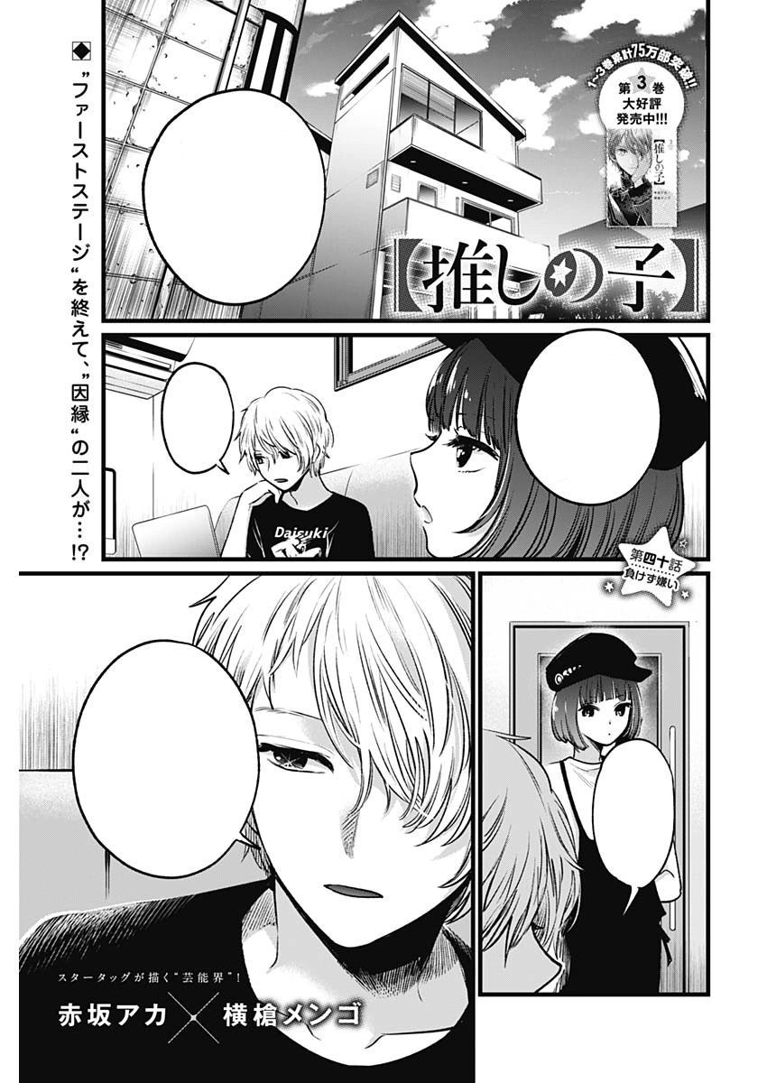 Sore Loser「負けず嫌い, Makezugirai?」 is the fortieth chapter of the Oshi no Ko manga series. It is written by Aka Akasaka and illustrated by Mengo Yokoyari. It was released in Weekly Young Jump on April 8, 2021.[1]
