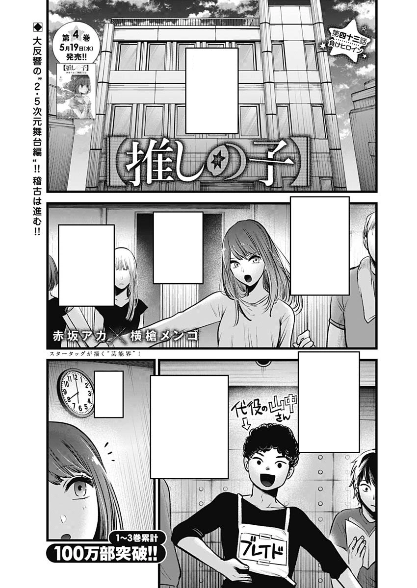The Losing Heroine「負けヒロイン, Make Hiroin?」 is the forty-third chapter of the Oshi no Ko manga series. It is written by Aka Akasaka and illustrated by Mengo Yokoyari. It was released in Weekly Young Jump on May 13, 2021.[1]
