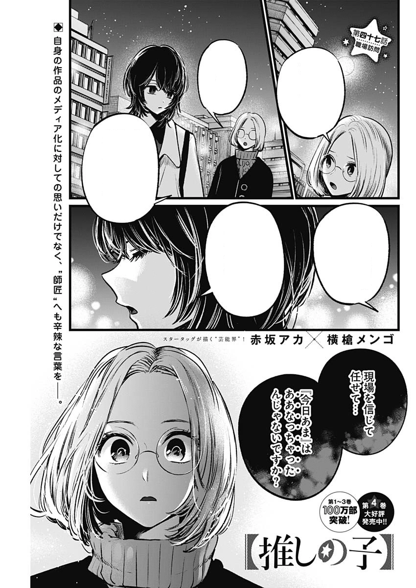 Studio Visit「職場訪問, Shokuba Hōmon?」 is the forty-seventh chapter of the Oshi no Ko manga series. It is written by Aka Akasaka and illustrated by Mengo Yokoyari. It was released in Weekly Young Jump on June 17, 2021.[1]