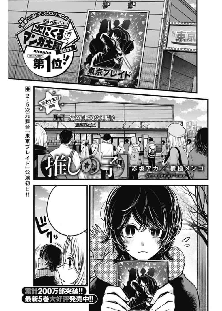 The Curtain Rises「開幕, Kaimaku?」 is the fifty-fifth chapter of the Oshi no Ko manga series. It is written by Aka Akasaka and illustrated by Mengo Yokoyari. It was released in Weekly Young Jump on September 9, 2021.[1]