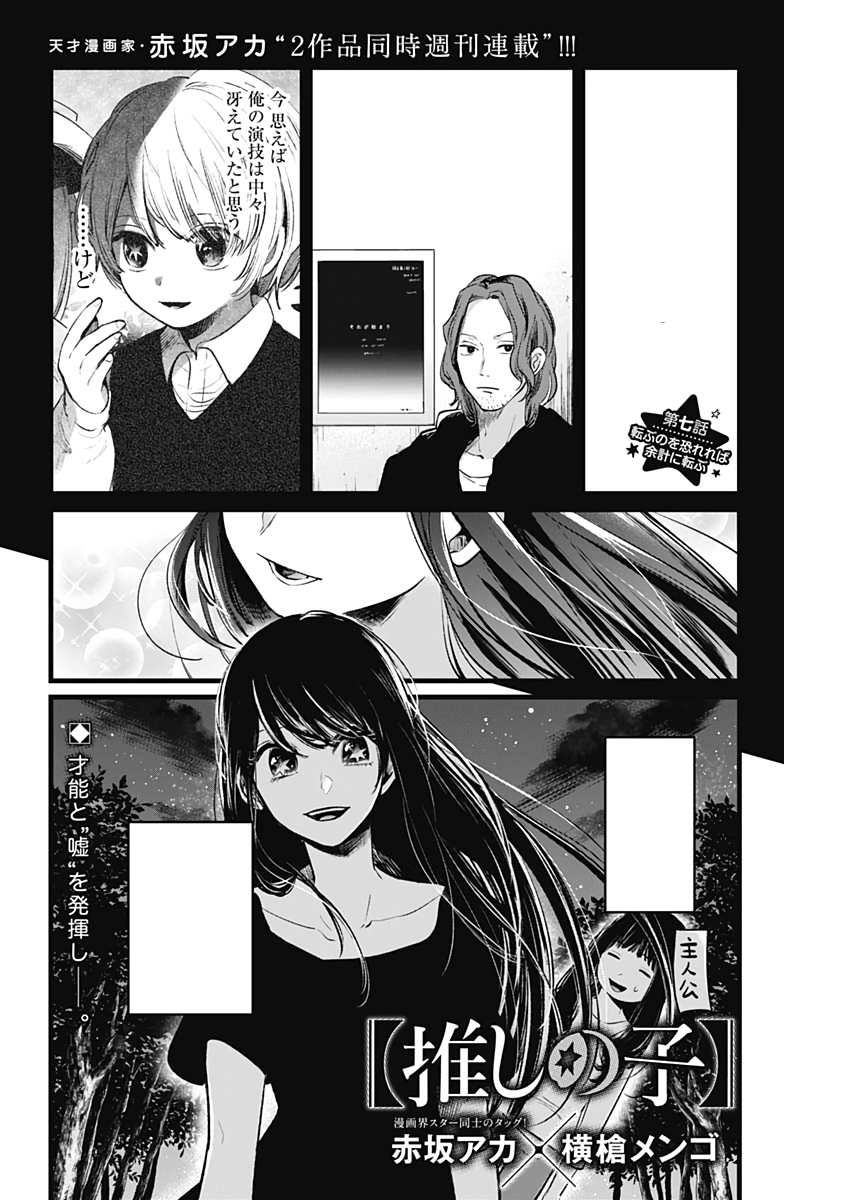 If You Fear Falling, You'll Fall Harder「転ぶのを恐れれば余計に転ぶ, Korobu no o Osorereba Yokei ni Korobu?」 is the seventh chapter of the Oshi no Ko manga series. It is written by Aka Akasaka and illustrated by Mengo Yokoyari. It was released in Weekly Young Jump on June 11, 2020[1], and in Mangaplus on April 28, 2022.[2]