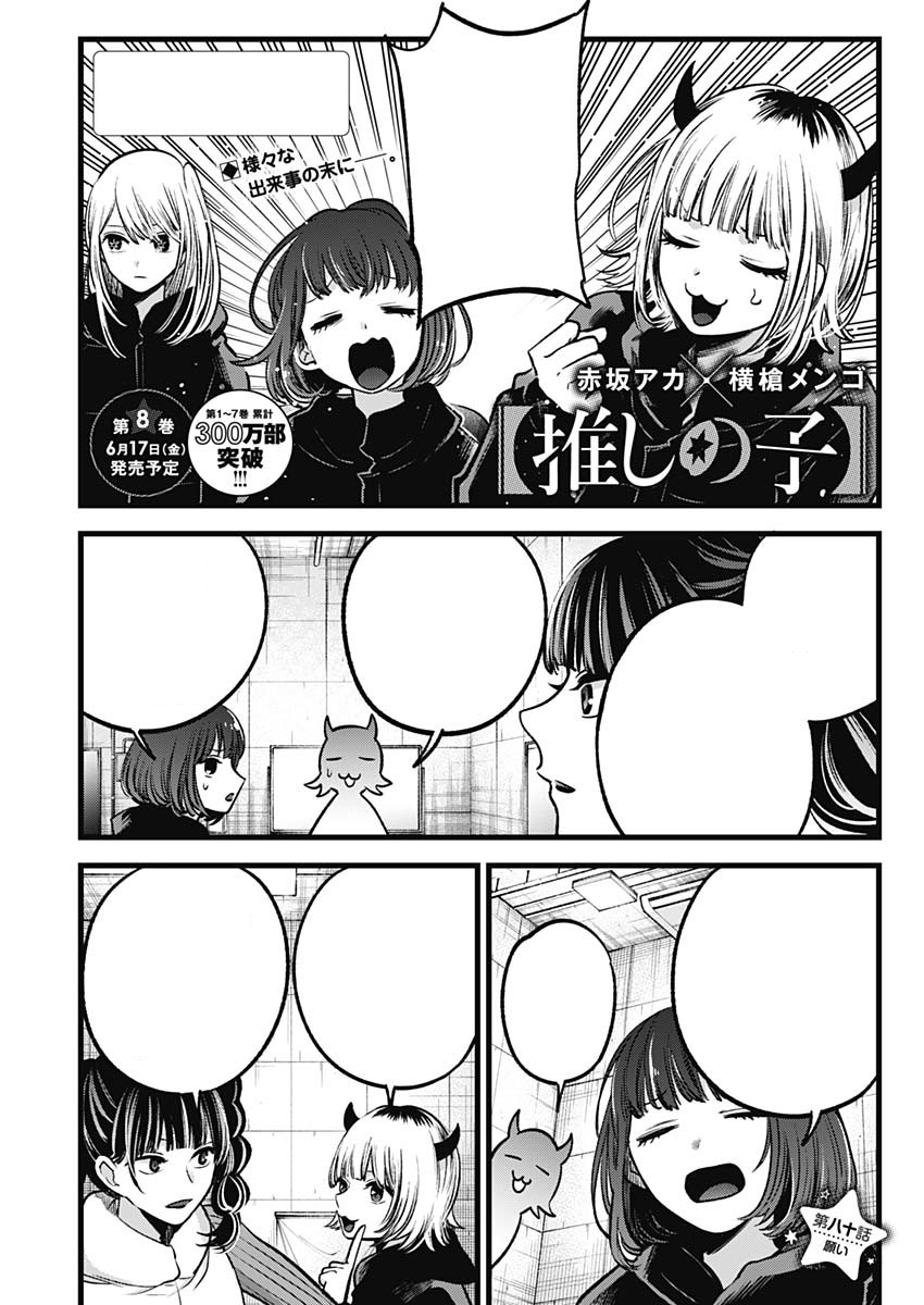 Wishes「願い, Negai?」 is the eightieth chapter of the Oshi no Ko manga series. It is written by Aka Akasaka and illustrated by Mengo Yokoyari. It was released in Weekly Young Jump on May 12, 2022.[1]