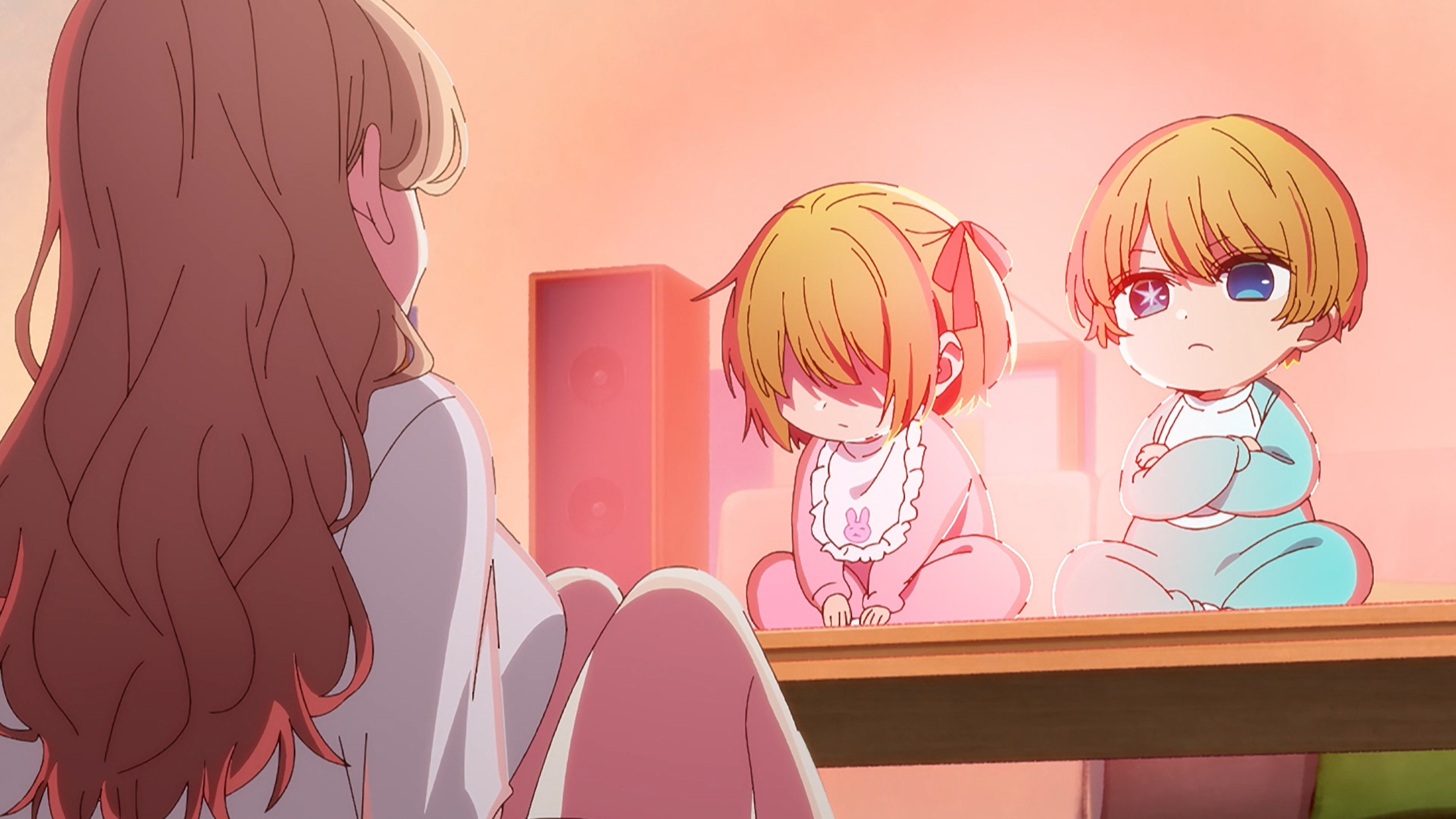 That night, while Miyako begrudgingly babysits Aqua and Ruby, Aqua turns on the tv to see his mother nearly flub an interview where she reveals she had a "baby." After this, B-Komachi performs one of their songs, and Aqua watches intently while seeing a positive side to his death from a murderous fan of his mother. Immediately, Ruby learns that their mother is on TV and fawns over her performance. It is revealed through Aqua that Ruby is another reborn individual after he found her having a flame war with some fans using their mother's smartphone. Unbeknownst to the two, Ai's stalker, who killed Gorou, was visibly upset that she lied to her fans and, more importantly, him.