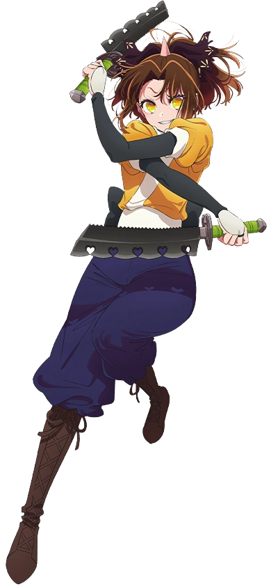 Kana is described as a cute girl having an innocent face, shoulder-length pinkish-red hair that has blunt bangs and pinkish-red eyes.